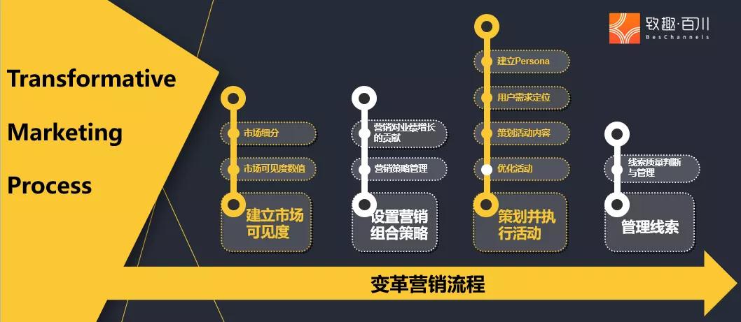 这一变革营销模型,包括了建立市场可见度、设置营销组合策略、策划并执行营销活动、线索生命周期管理四个过程,覆盖空白区的用户触点,加速转化。