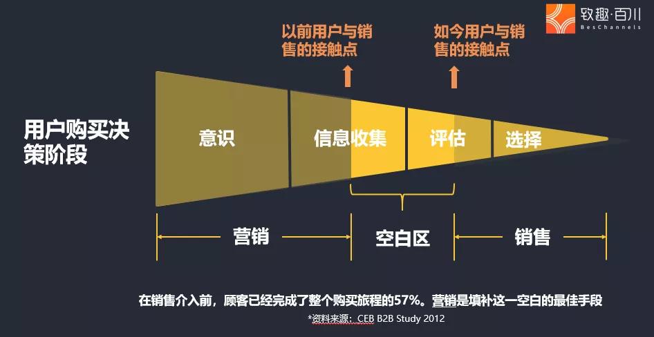 如今多元化的媒介环境,让用户不再需要依赖销售获取信息,用户与销售的接触点在向漏斗后端偏移,直到他们开始“评估”这个产品的时候,才会开始去接触销售。