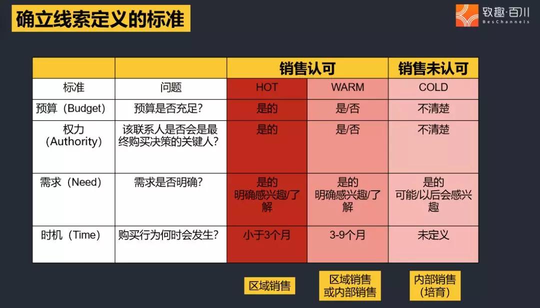 所以企业需要建立一套市场和销售都认可的线索质量判断标准,而BANT法就是一种普适性很高的判断模型,适用的范围非常广泛。BANT法包括: