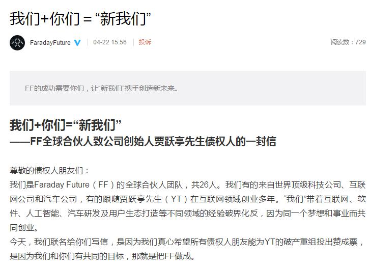 贾跃亭也希望通过合伙人机制的落地能够有效地规避乐视的三大错误,同时推动FF在产品和技术创新、商业模式创新和用户生态创新基础上实现公司顶层治理架构的创新。FF表示,感恩所有贾跃亭债权人长期以来的理解、支持和付出,也恳请债权人对贾跃亭个人破产重组方案投赞成票。