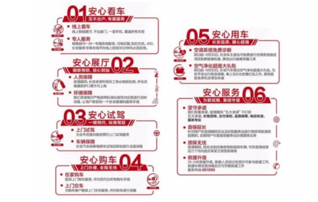 第三是开展营销服务创新。一方面布署各地4S店陆续开启“一对一视频看车”和“直播看车”的服务,2000余名专业销售顾问,实时在线直播,让消费者在家可以通过网络了解、购买车辆。另一方面进行创新服务。在疫情爆发后,以客户为尊的长安汽车坚持“五大承诺”服务不打折,围绕用户特殊时期的服务需求,结合疫情防控形势,推出 “六大安心计划”,守护用户用车、看车、购车每一程。
