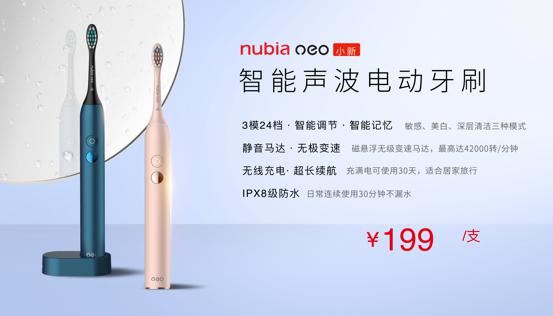 本次nubianeo(努比亚小新)推出的第一款个护产品是nubianeo智能声波电动牙刷,其具有3模24档智能调节,可智能记忆敏感、美白、深层清洁三种模式,自动根据用户偏好选择更适合的模式,省心又省力;同时具有IPX8级防水等级,日常连续使用30分钟不漏水;并且支持无线充电,续航也非常强劲,一次充电可使用30天,无论家居和旅行都能保障用户的牙齿健康。