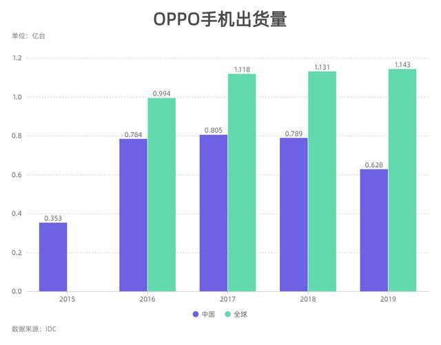 从IDC统计的数据来看,2019年OPPO手机在中国出货量严重下滑。2019年OPPO手机在中国出货量为6280万台,排名第三,其出货量同比下滑20.4%,仅次于vivo。