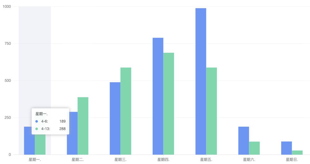 通过将多个日期下的相同时间段的数据“图表可视化”为随着时间段变化的对比柱形图,从图中我们可以了解到这些信息: