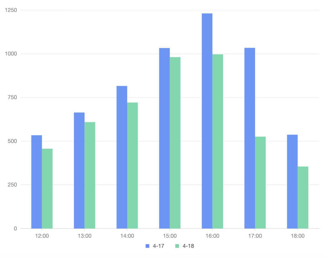 下图是星期五和星期六的访问用户量的分时段柱形图(截取部分时间段),运用上面提到的观察角度,很容易就能发现虽然日期不同,同时段的数据有大小差异,但是数据趋势是具有共性,都从12点开始呈增长趋势,在16点达到峰值,之后呈下降趋势,我们就可以得出我们用户访问行为的规律。