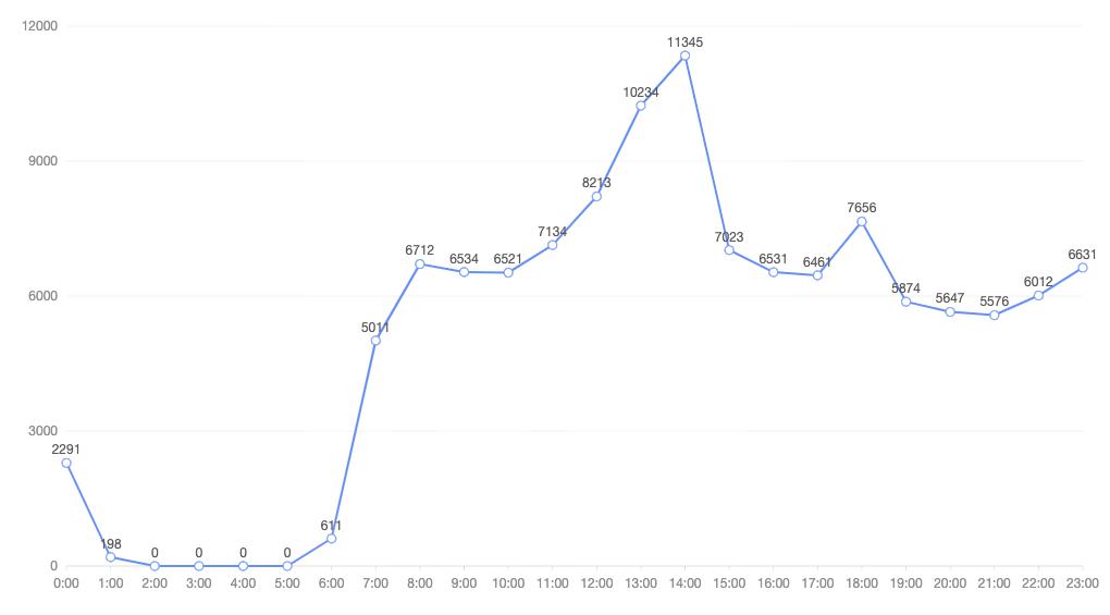 通过“分时维度”得到一天内不同时间段的数据值,将这些数据“图表可视化”为随着时间段变化的折线图,从图中我们可以了解下面的这些信息: