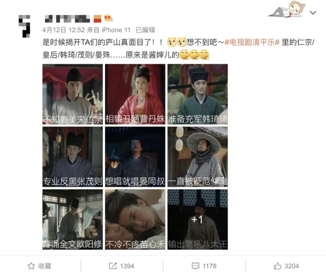 在服务《清平乐》时,项目团队根据剧中重要角色的人设,制作了「不知妻美宋仁宗」「一直被贬范仲淹」等段子九宫格。