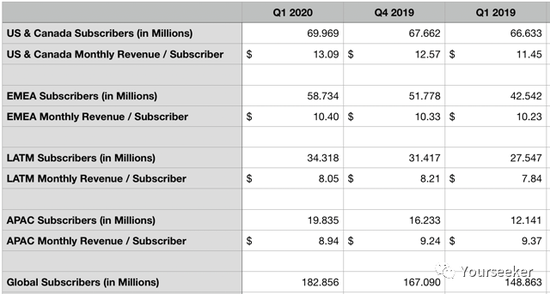 另外附一张本季度、上季度以及去年一季度全球四个主要地区 Netflix 的用户量和 ARPU: