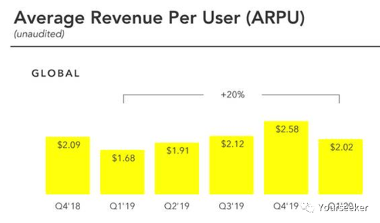 可以看到,从 2018 年第四季度到 2019 年第一季度,Snap 的 ARPU 下降了 16.9%。