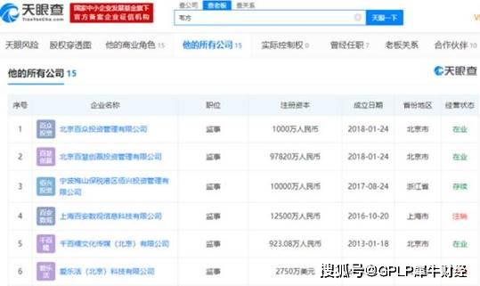 据天眼查数据显示,韦方共担任百度旗下15家公司的监事,包括百度(中国)有限公司、北京百度网讯科技有限公司、百度在线网络技术(北京)有限公司等。