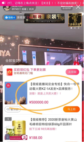 除此之外,作为直播界超级大V ,薇娅在4月1日与中国航天科工集团合作在直播上上架“快舟一号甲固体运载火箭”的发射服务和品牌服务,售价约为4000万元,当场下单定价50万元。当大家准备看薇娅笑话的时候,结果仅一秒钟800余人下单,秒光。