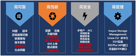 浪潮分布式存储在不断迭代的过程中,除了前面提到的同城容灾之外,还开发了大量的其他高级特性。一是小对象聚合。浪潮对象存储针对海量小文件场景,通过小对象聚合,节约HDD的磁盘IO,提升存储效率。二是读Cache加速。在卡口图片、AI计算场景,通过读Cache加速提升数据读取效率。三是元数据检索。在存储系统内集成索引引擎,实现根据对象元数据多条件模糊检索对象的技术,有效地提升了海量非结构化数据中“大海捞针”的效率。四是企业级WORM,满足企业客户数据的法规性要求,结合应用特点,灵活设置宽限期和保护期。此外,还有存储OS加固、桶策略配置等等。