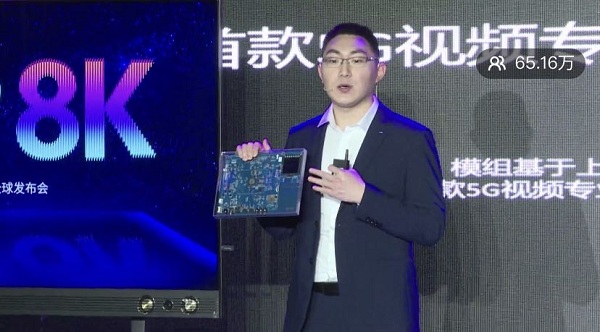 昨晚长虹首发的“5G+8K”电视,搭载了长虹研发的5G视频模块,该模块基于上海海思5G模块中间件,具备从视频采集、编码、传输、解码到显示等“端到端”的8K芯片解决方案能力。在5G网络下,电视端可以远程播放3D超高清视频、传输8K视频流,甚至实现赛场环境实时传输。同时,还可以电视为中心连接家庭物联智能设备,为用户带来AIOT(智能物联网)的体验。