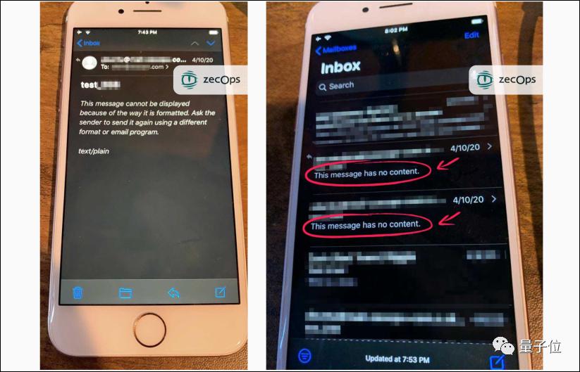 黑客在iOS 12上尝试利用漏洞后,用户可能会遭遇邮件App突然崩溃的现象,之后会在收件箱里看到“此消息无内容”这样的邮件。