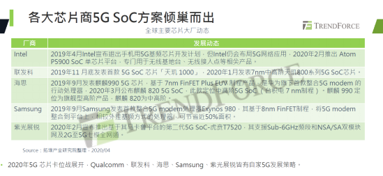 2020年5G SoC制程走向成熟,加上5G终端技术与运营商网络投资,预计2020年底,在终端厂商和运营商共同推动下,芯片和终端成本下降,5G手机用户提升。初期5G SoC定位在高阶手机使用,以期能快速提升5G手机渗透率。