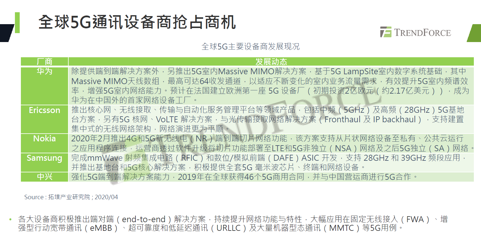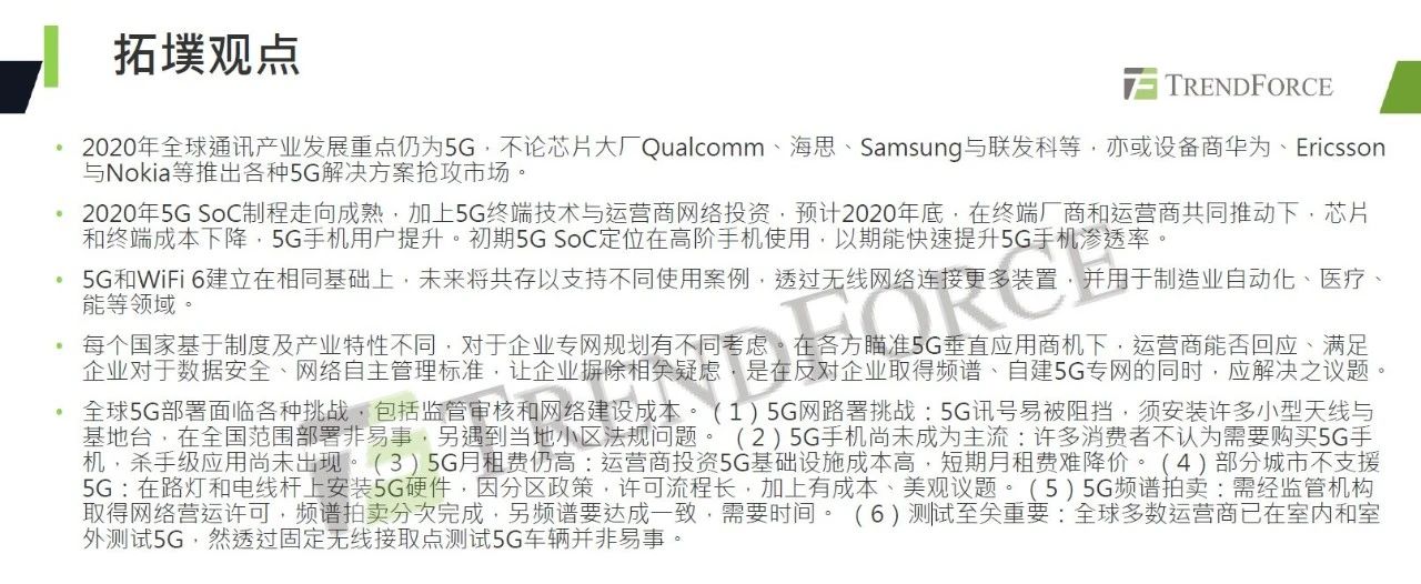 谢雨珊表示,2020年全球通讯产业发展重点仍为5G,各个国家正通过相关政策和措施积极推动5G应用发展,近两三年全球将迎来一波大规模5G部署。2020年5G芯片卡位战展开,高通、联发科、海思、三星、紫光展锐等芯片厂商皆推出自家5G SoC方案;华为、爱立信、诺基亚、三星、中兴等通讯设备商亦积极推出端对端解决方案以抢占商机。