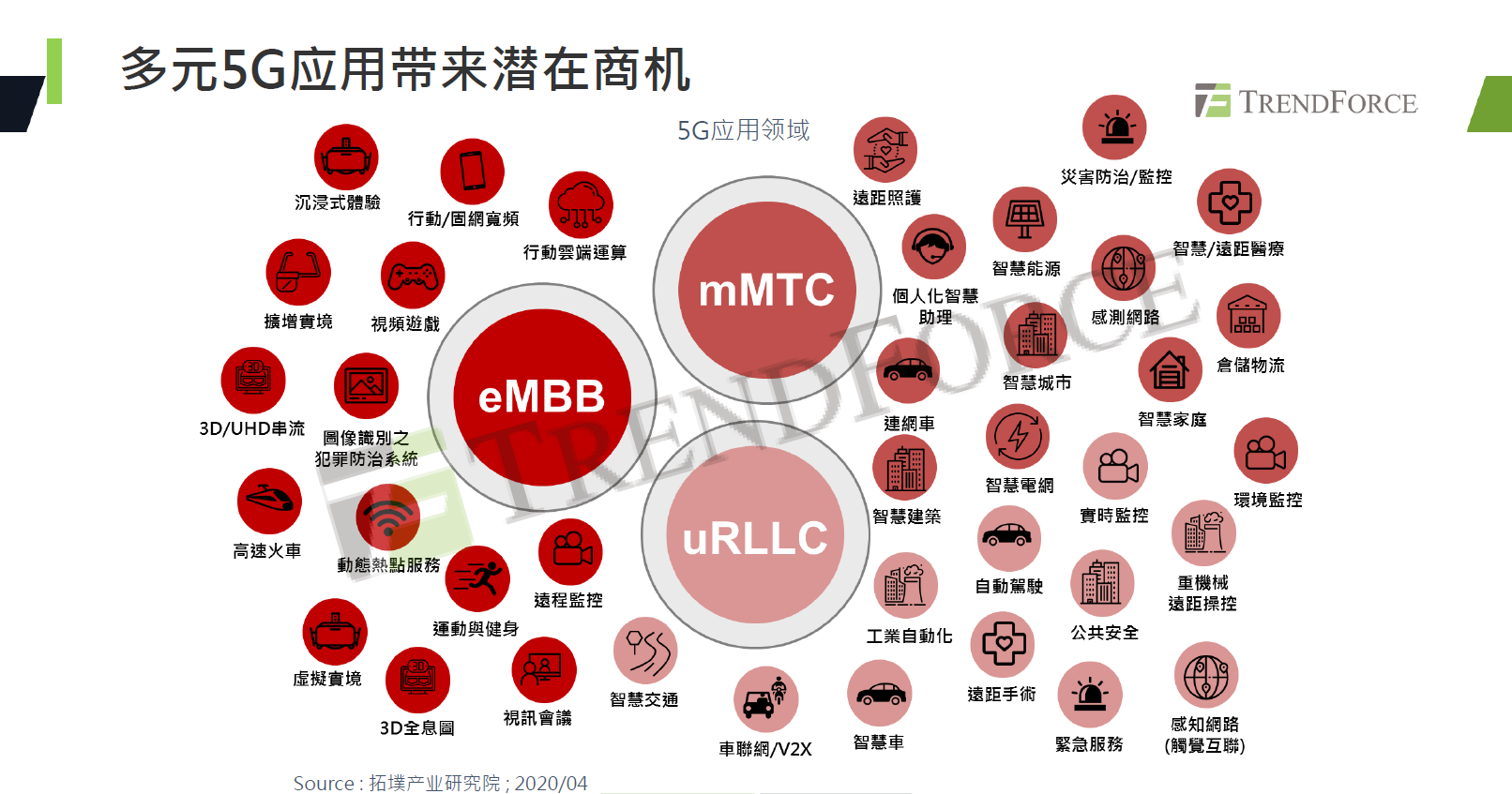 随着5G商用持续发展,多元5G应用将带来非常多的潜在商机,主要可分为mMTC、uRLLC、eMBB三大类,mMTC部分包括如智慧/远距医疗、智慧能源、感测网络等,uRLLC部分包括车联网、自动驾驶、工业自动化、公共安全等,eMBB部分包括增强实境、沉浸式体验、视频游戏等。