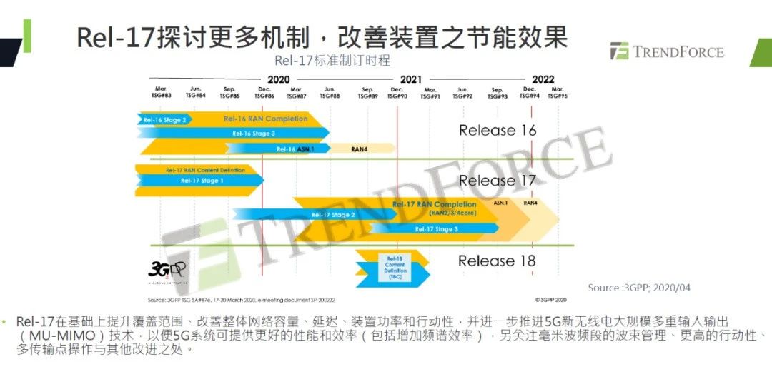 5G标准和技术方面,Rel-17在基础上提升覆盖范围、改善整体网络容量、延迟、装置功率和行动性,并进一步推进5G新无线电大规模多重输入输出(MU-MIMO)技术,RAN1开始研究对5G NR整体效率和性能等。5G基站以采用大规模数组天线技术为主,随着全球加速5G升级扩网,将引爆基站商机。