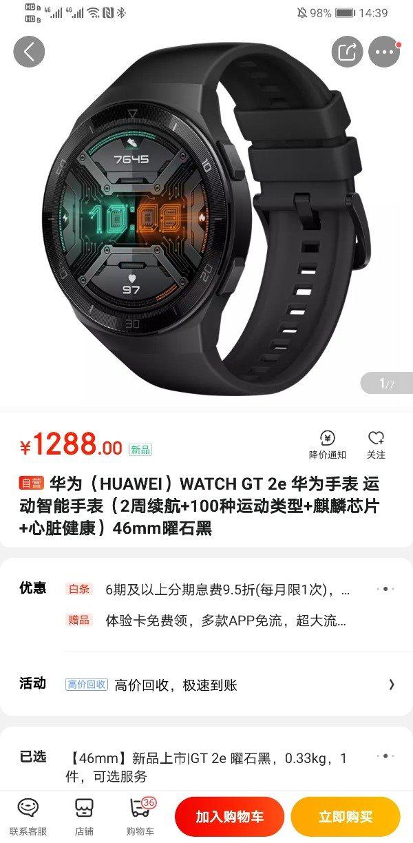 原标题:京东提前曝光华为Watch GT 2e国行价格:46mm表盘售1288元