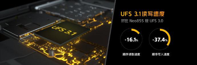 iQOO Neo3搭载UFS 3.1,相对上代iQOO Neo 855版的 UFS 3.0 ,顺序读取速度提升 16.1% 、顺序写入速度提升37.4%,超大文件,一闪即存。