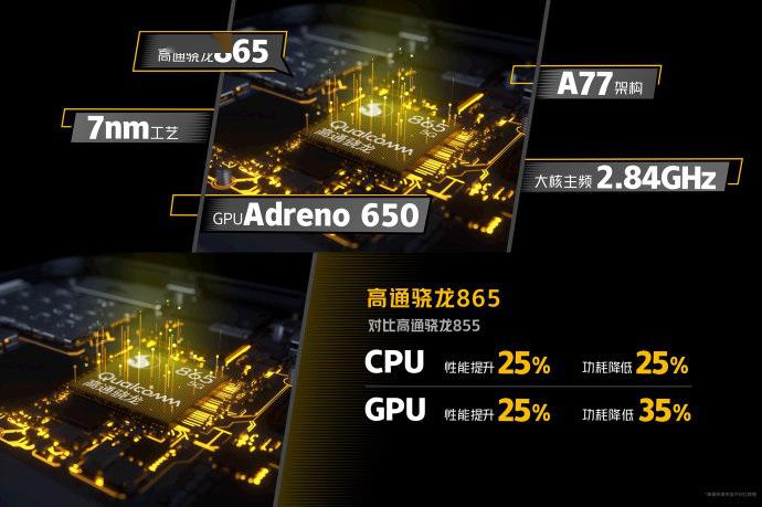 iQOO Neo3搭载高通骁龙865处理器,与骁龙 855 相比,CPU 性能提升 25%,功耗降低 25%;GPU 性能提升 25%,功耗降低 35%。