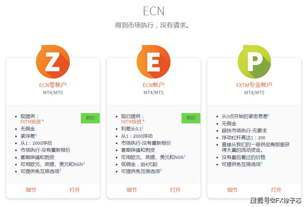 ECN账户分为ECN零账户(无佣金)、ECN账户(低佣金,4美元起)、FXTM专业账户(更快的进出金)。