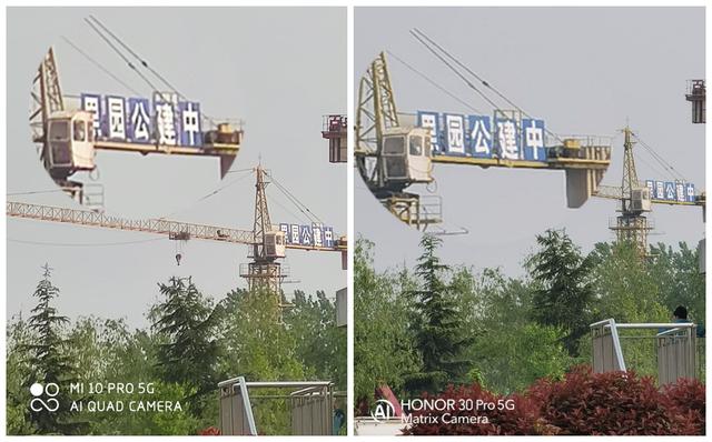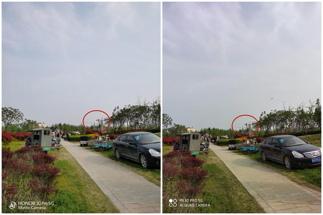 变焦方面,荣耀30 Pro支持5倍光学变焦,10倍混合变焦,以及50倍的数字变焦,而小米10 Pro是支持10倍混合变焦,以及50倍的数字变焦,实际的取景中,荣耀30 Pro更好用也更清晰,荣耀30 Pro在拍摄拉近的过程中,相机界面会出现提示框来提示当前变焦的位置。第一组照片笔者画圆圈标记的地方,通过第二组照片放大拉近,照片内的字清晰可见,远比我们人眼能观察到的位置还要远,而变焦谁好谁坏,相信不用笔者多说了,真正一眼的差别,荣耀30 Pro变焦后字体更清晰,且噪点更少。