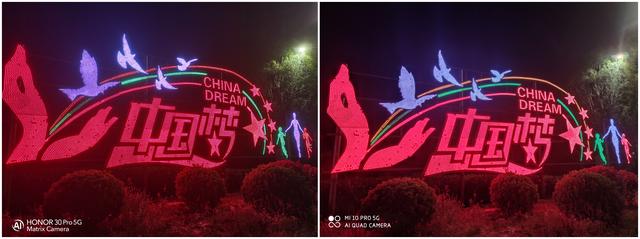 白天场景下,荣耀30 Pro和小米10 Pro的照片样张表现都很不错,无论是照片的解析力,还是照片的细节处理都有着较为优秀的表现,不过两款手机在风格的表现上完全不同,第一组近景荣耀30 Pro色彩艳丽,而小米10 Pro则要明亮一些,而在广角的远景上,两者的风格却调换了过来。从这里我们也可以看出,对于目前的旗舰手机来说,白天拍照对于它们来说已经没有什么压力,差别也就是在画面风格的调教上,就看大家更喜欢那种调教风格了。