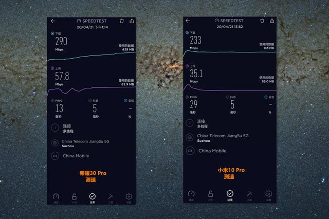 接下来我们来看一下实测,笔者通过在同一区域使用同样的运营商对两部手机进行5G网络测速,测速软件笔者选用也是我们最常见的SPEEDTEST,通过对荣耀30 Pro和小米10 Pro的5G网络测速,得到了下图当中的成绩,我们可以看到麒麟990 5G Soc集成的5G基带,在网络测速上要好于骁龙865的外挂5G基带,从这点上也可以看出麒麟芯片集成5G网络基带上的优势,所以在5G网络方面荣耀30 Pro得1分,且是对骁龙865碾压的姿态胜出。