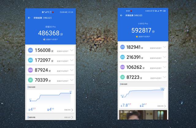 通过图表我们可以看到两款手机的表现都很不错,不过小米10 Pro的50W有线充电在速度上还是要略快于荣耀30 Pro的40W有线充电,所以这里得分的为小米10 Pro。