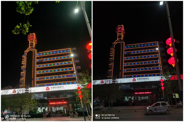 接下来就是夜景部分,荣耀30 Pro和小米10 Pro都有夜景模式,这也是专门针对有夜间拍照需求的人而设定的,整体对比下来小米得益于1亿大像素,在夜间的解析力要稍强一些,而且对于光晕的压制稍好,不过小米10 Pro在一些照片上有过度压制曝光的表现,大家可以仔细看第二组照片,小米Pro为了照顾画面的纯净度,左上角的绿叶已经完全看不到了,而荣耀30 Pro则很好的把树叶进行了保留。
