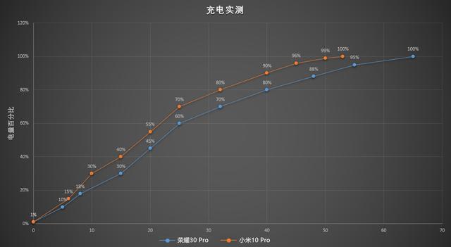 目前手机电池的续航可以是整个行业的痛,在电池技术没有重大的突破下,厂商们改变策略,通过提升手机充电的速度来增加使用体验。荣耀30 Pro内置了一块4000mAh的电池,支持40W的有线快充,官方宣称30分钟可以充75%的电池,1小时即可充满。小米10 Pro则是内置了一块4500mAh的电池,支持50W的有线快充,官方宣称最快45分钟可以充满。笔者也是把两款手机用到没有电,然后进行充电,并实时记录充电的数据,得到以下充电的曲线。