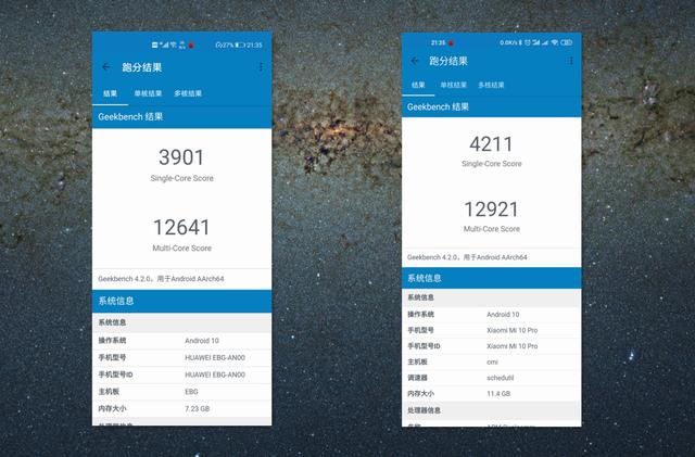 接下来笔者又通过Geekbench对两款手机的CPU进行了跑分测试,测试结果如下,荣耀30 Pro上的麒麟990 5G SOC的单核成绩为3901分,多核成绩为12641分,而小米10 Pro上的骁龙865的单核成绩为4211,多核成绩为12921,整体差距不大。