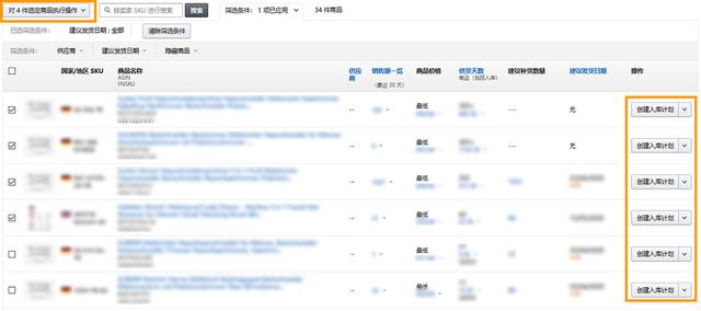 选择需要补货的SKU,点击右侧的【创建入库计划】,即可创建货件。要为多个 SKU 创建入库计划,请勾选每个相关 SKU 左侧的复选框,然后点击【对 # 件选定商品执行操作】,并选择【创建入库计划】。
