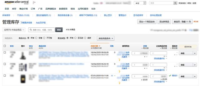 您可以在“卖家平台>库存>管理库存”页面查看所有SKU 的库存状态。