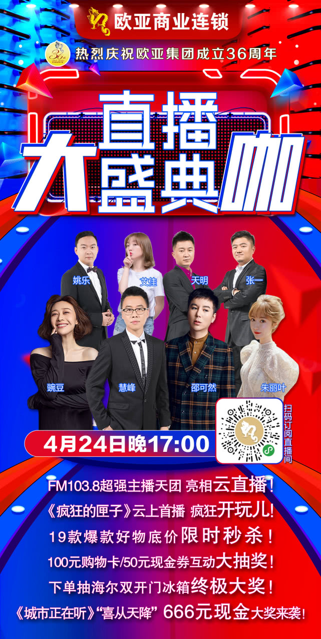 4月24日17:00,欧亚商业连锁店庆第二场大型直播盛宴再次火热开启,继4月15日首场直播盛宴FM96.8频道著名主持人飞扬、唐白虎、蕙子亮相直播间后,FM103.8超强主播天团再次强势助力欧亚商业连锁36周年庆,慧峰、豌豆、艾佳、姚乐、天明、张一、邵可然、朱丽叶8大明星主播亮相云直播,19款爆品尖货限时秒杀,再次以令人惊喜的直播价引爆欢乐的下单潮。