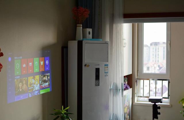 上面的测试环境阳光照射进来的比较多,所以效果会有一些损失。而这个场景上背着阳光的,大家可以看到效果就有了很大的提升。照片中,你可以看到阳台柜子门都是清晰可见的,沙发的细节也都很明显。虽然白天使用投影仪不是正常的使用场景,但是白天如果都没问题的话,夜晚自然就不用多解释了。