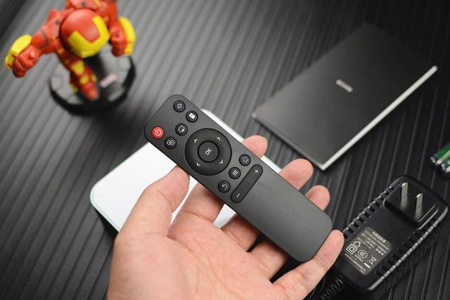 遥控器的设计采用的是简约风格,虽然按键不多,但是功能齐全。你甚至可以通过遥控器的按键切换,将遥控器切换成鼠标的功能,这个功能我也体验测试了,还是比较新颖有趣的。