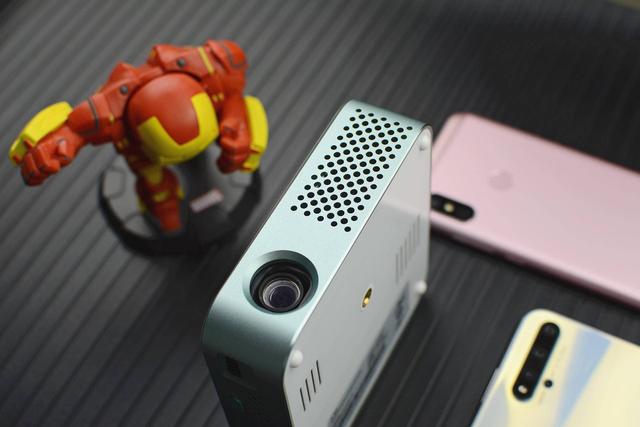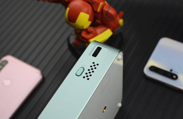评测的重头戏就是投影仪本身,投影仪看着很小,重量只有480g,厚度也仅仅是29mm,宽度则为114mm。这个设计,足可以让你把它放到口袋里,走到哪里都可以享受观看电影的乐趣。另外,投影仪的面板还有隐藏功能设计,这点我后面说。