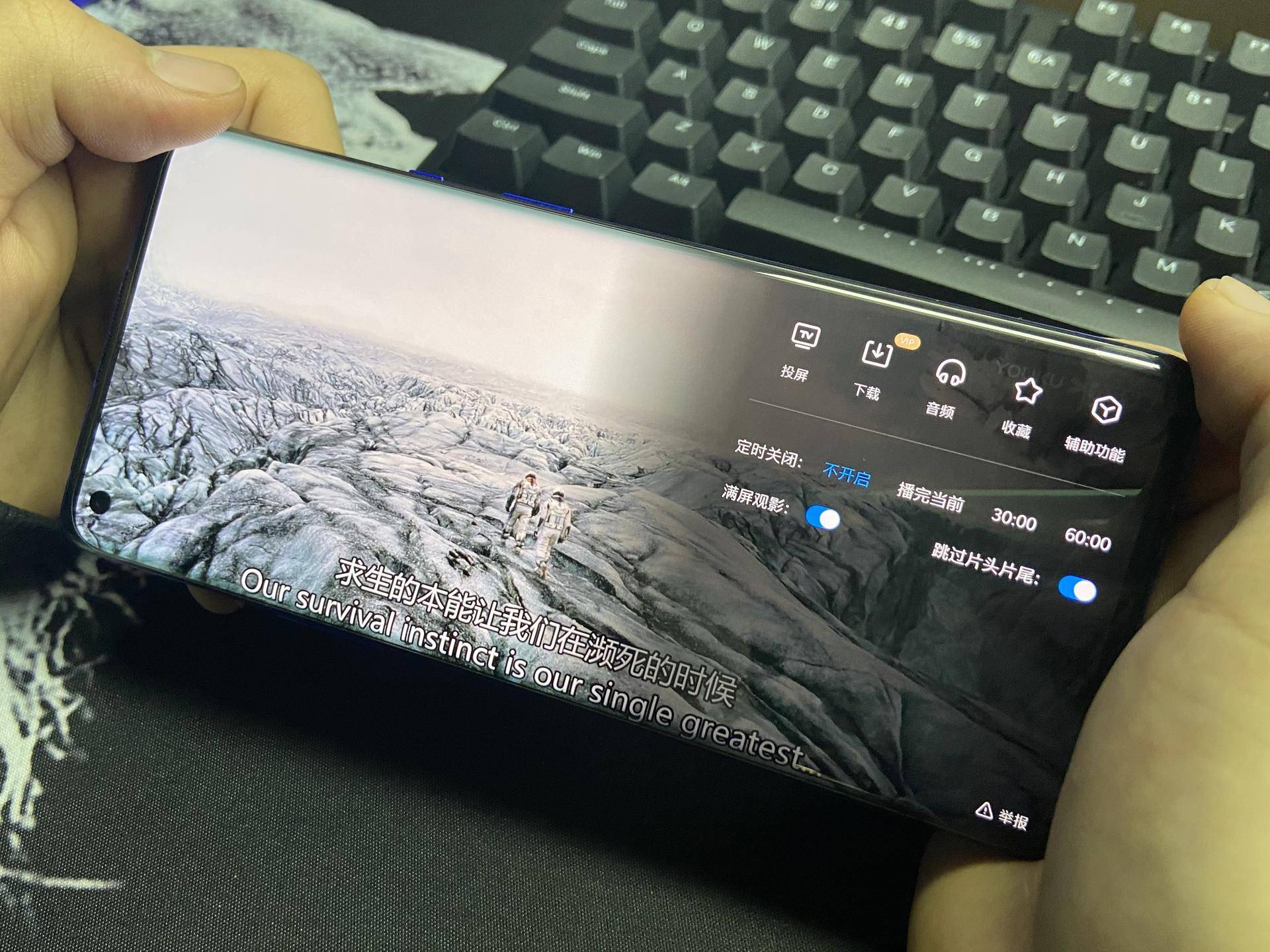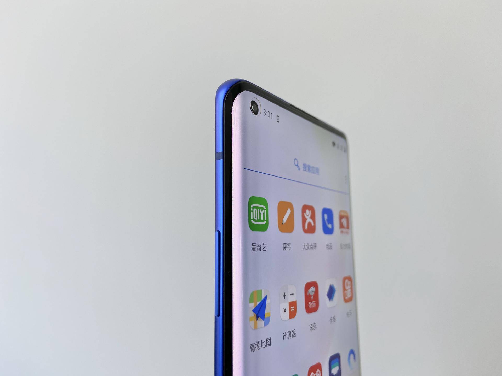 从外观上来看,左右两侧为3D曲面玻璃,上下略有黑色边框,屏幕采用左上角挖孔设计,官方称之为“瞳孔屏”,孔径3.8毫米,切割区域较小,个人使用实际观感对于友商一众“挖孔屏”来说,开孔算是比较小的了。