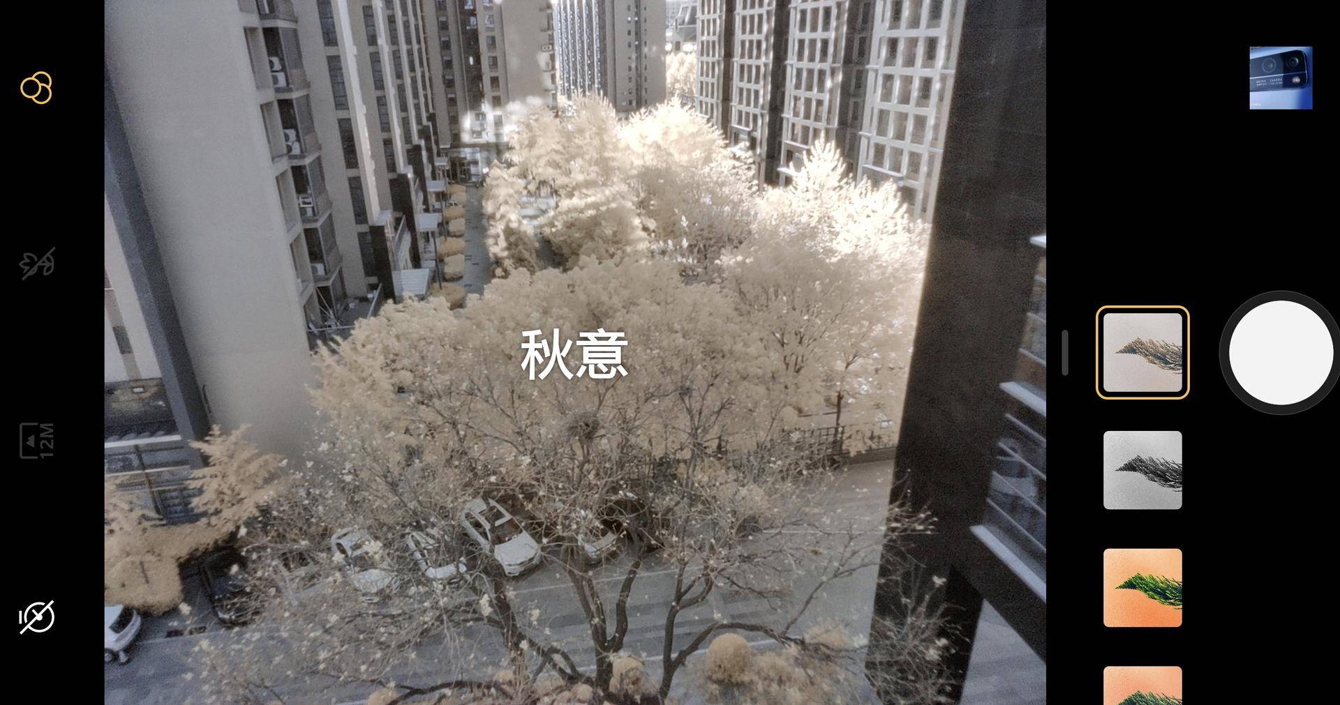 一加 8 Pro 长焦采用一颗800W像素镜头,支持 OIS 光学防抖,支持3倍光学变焦,最高30倍数码变焦。此外还有一颗辅助滤光镜头,让相机可玩性更高,可以直接打开相机,选择“秋意”。