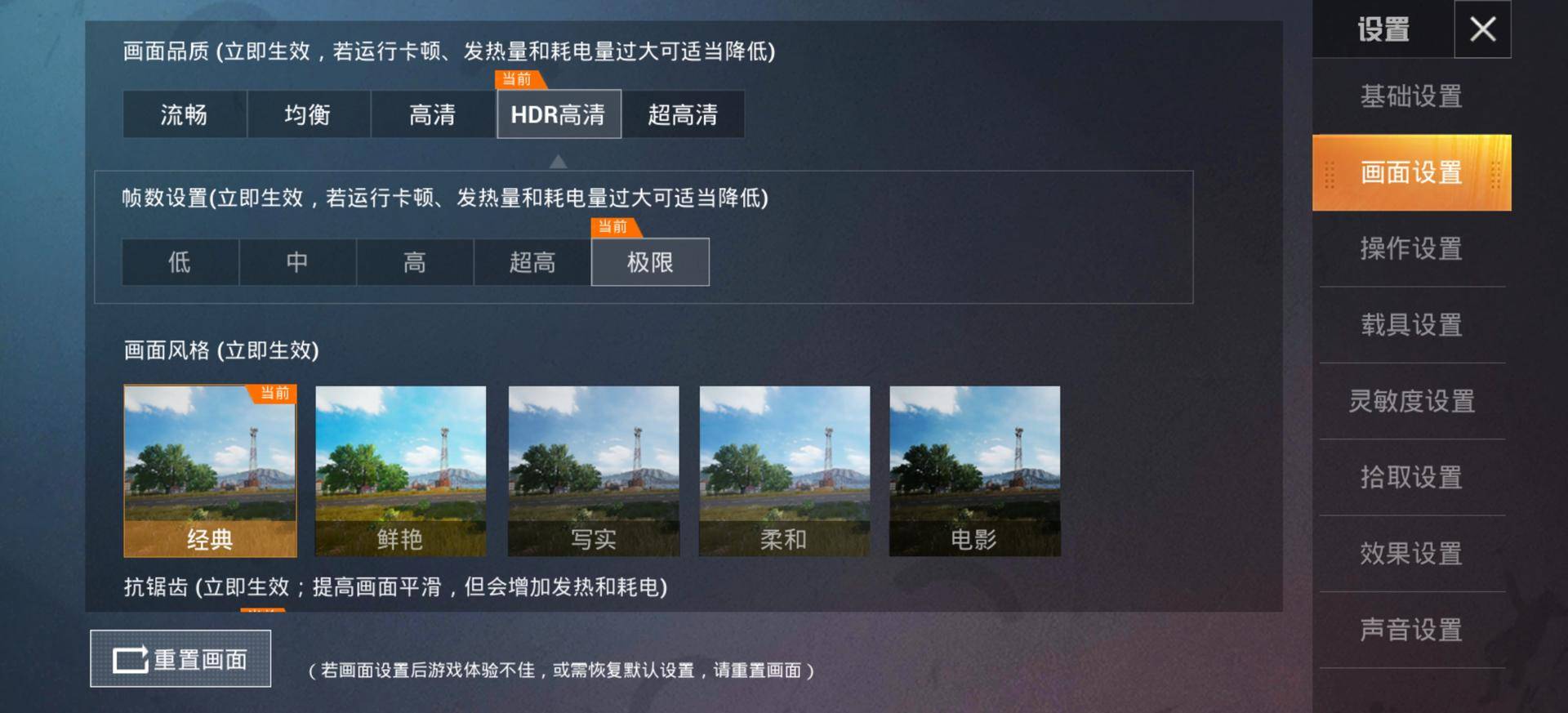 实测和平精英画面品质HDR高清,帧数设置极限情况下优化较为清晰,画面流畅不卡顿。