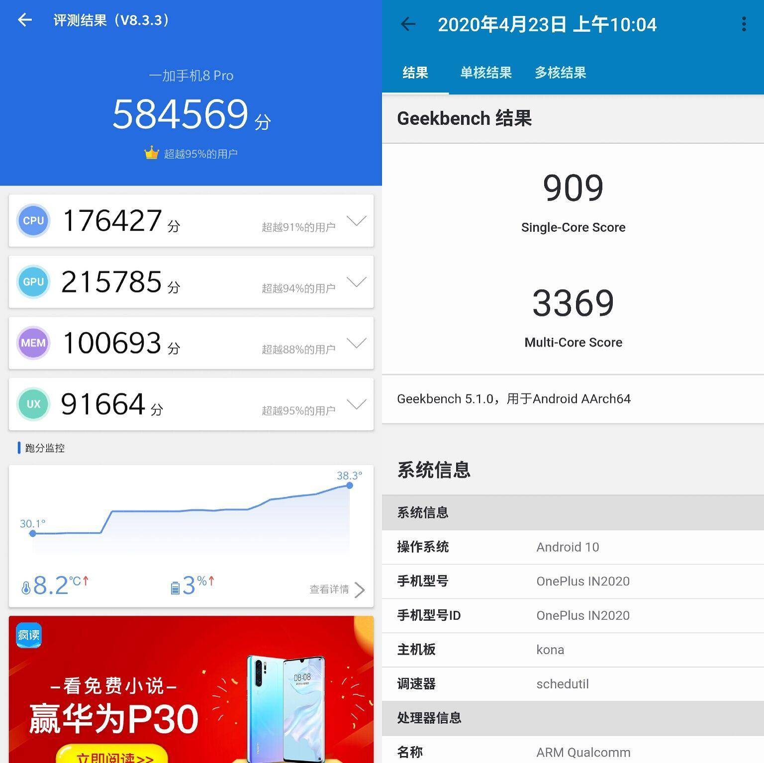 通过跑分软件测试,我们可以看到一加 8 Pro安兔兔成绩达到了584569的高分,Geekbench 5单核成绩为909分,多核成绩为3369分,从跑分成绩来看一加 8 Pro的性能表现符合高通骁龙865处理器性能。