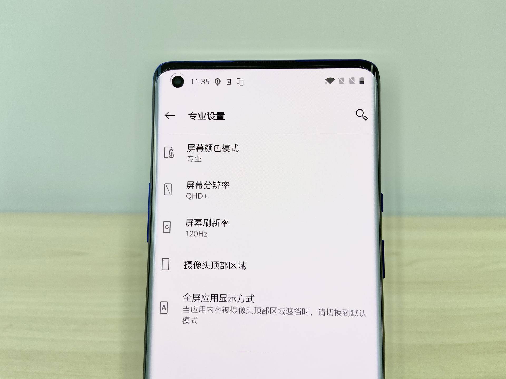 在显示中的专业设置里可以调节屏幕颜色模式、屏幕分辨率、屏幕刷新率、摄像头顶部区域、全面屏应用显示方式。
