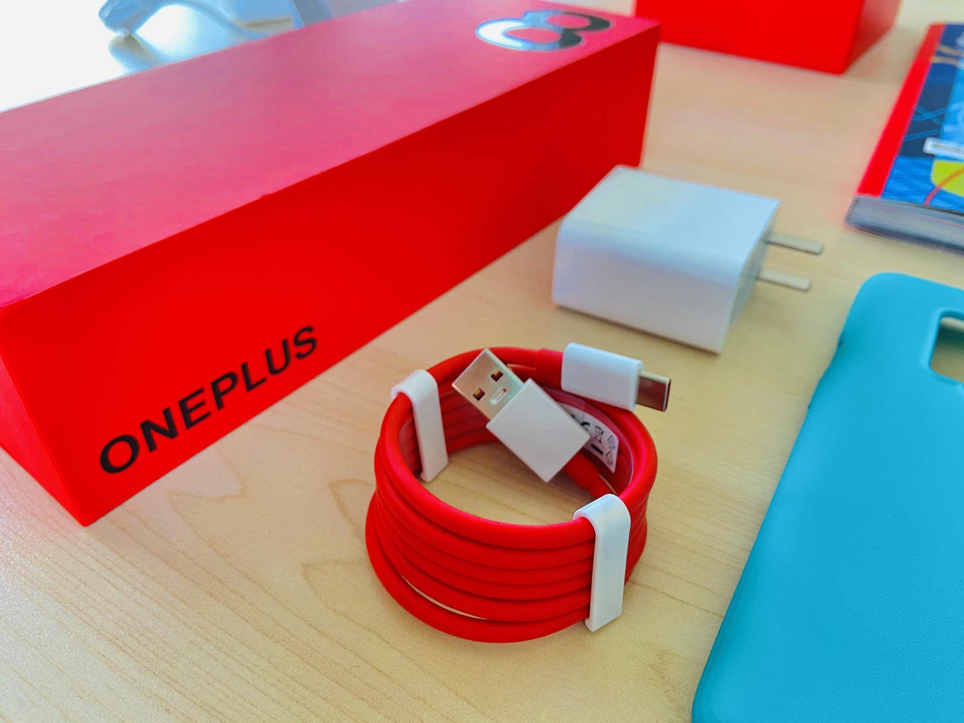 打开本体手机盒,里面仍旧是一加经典的Warp30T充电器和红色的数据线,另外附赠了一个透明的保护壳。