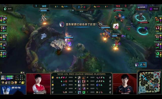 [12:00] 盲僧单人偷下小龙,属性水,本场龙魂为火龙魂,随后TES三人下路越塔击杀加里奥,WE众人赶来打散TES阵型,WE打出一换四后推掉了TES下一塔。