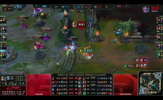 [10:30] 巨魔单人偷下第一头峡谷先锋,随后WE上中野三人推掉了TES上路两座塔。