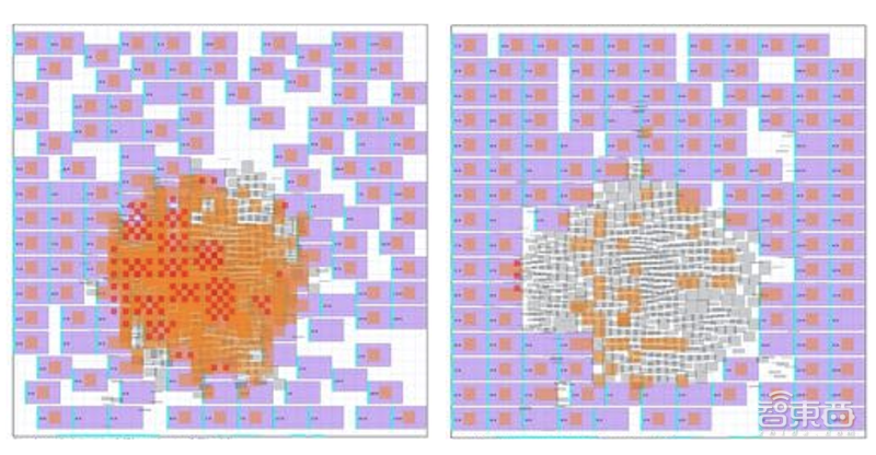 下图左边是人工布局的结果,右边是谷歌新方法的布局结果。白色区域为宏位置,绿色区域为标准单元位置,新方法在标准单元周围创建环状的宏布局,从而减少总线长。