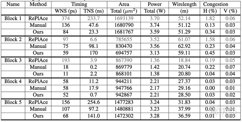 ▲谷歌新方法与RePlAce方法、人工布局方法的实验结果对比(表中所有指标越低越好)