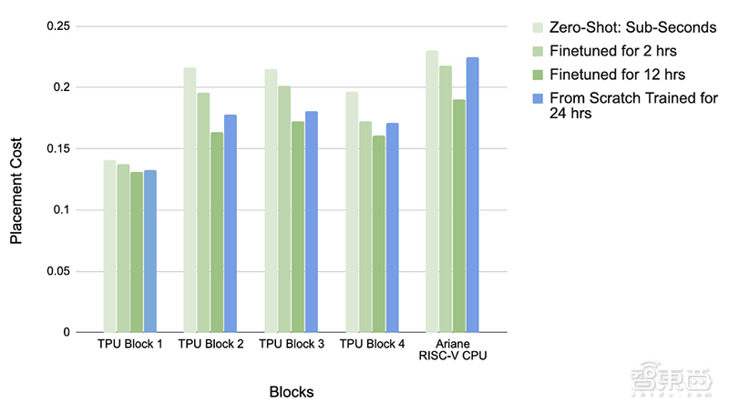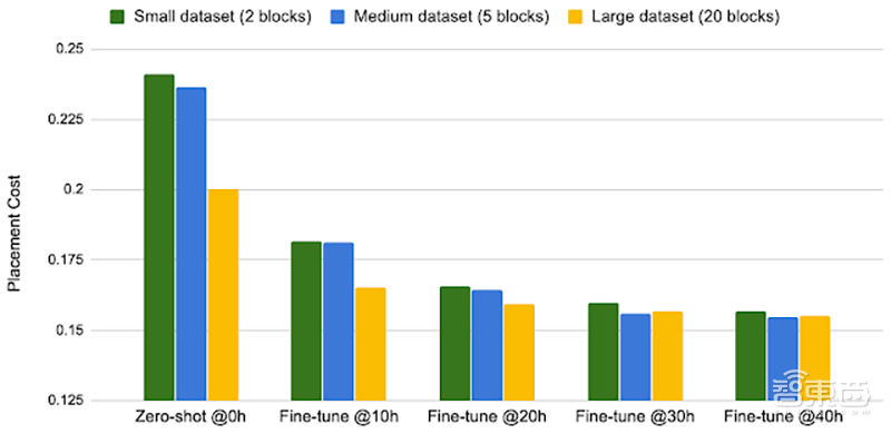 谷歌的新方法,在最大的数据集(20个TPU块)上使用预训练策略,然后在块1到5表示的5个目标不可见块上对其进行微调。相比模拟退火算法需要18个小时来收敛,而谷歌端到端的学习方法耗时不超过6个小时。